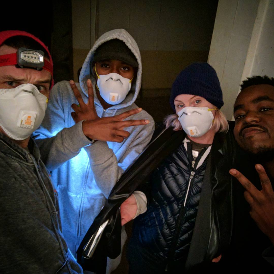 wrapping out of a quite unsettling location left to right: director chris morgan, Thank Aaron, producer Dana Gabrion, and Marco Pavé