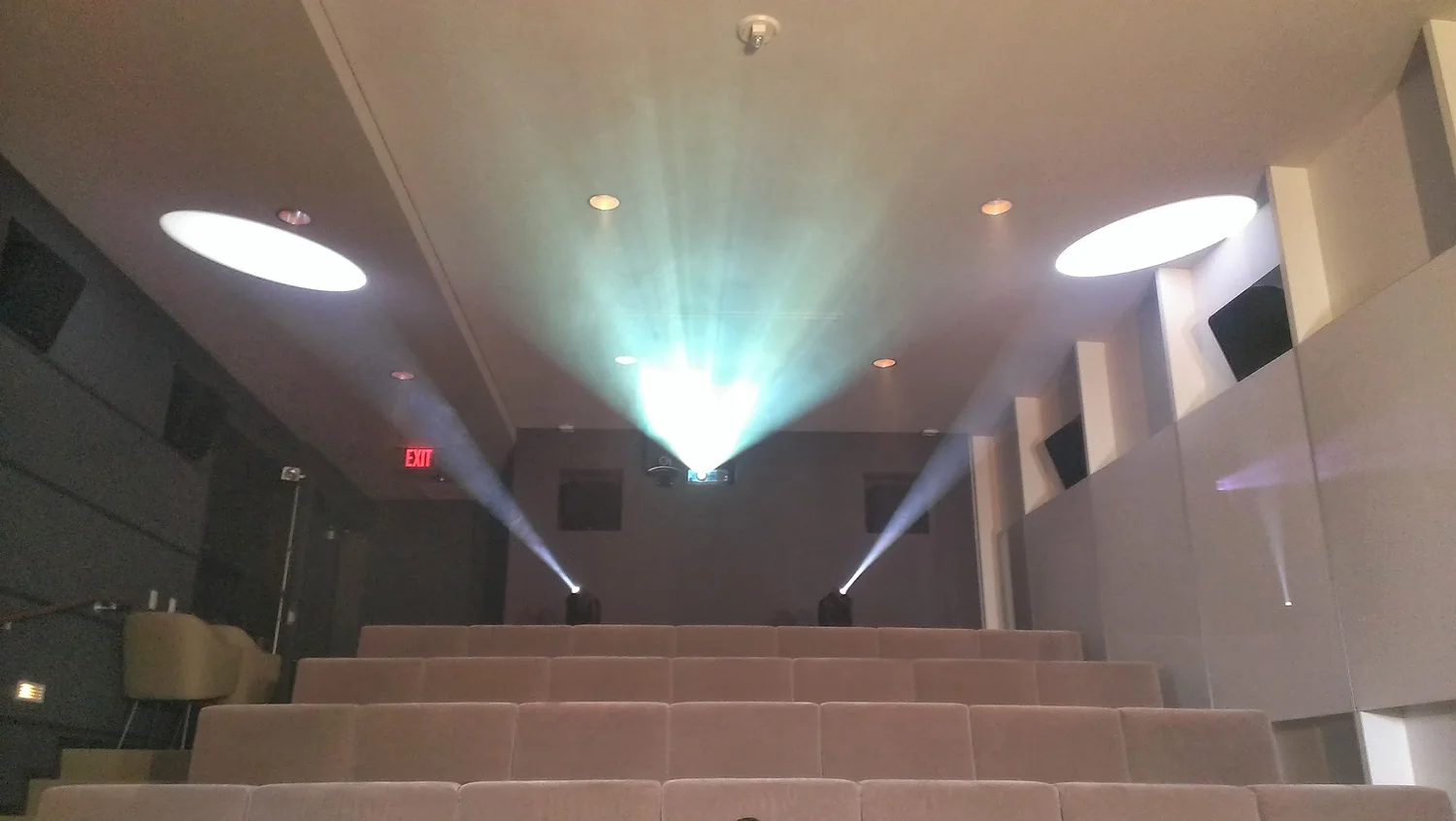 i took advantage of a few relatively amazing opportunities during the shooting, one of which was the use of AOL's presentation theatre, which we used for one of the scenes, lit with both the existing projector as well as DEM's workhorse LED fixtures which added a bit of a festive feel to the theatre shots.