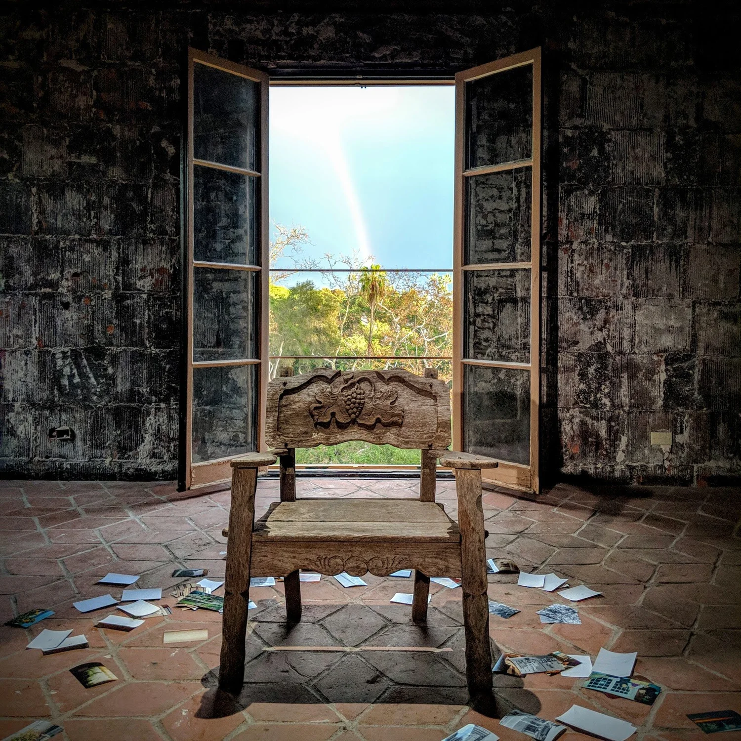 the location was an amazing santa barbara property that was under repair, exposing the rough brickwork below the plaster. the entire video is lit with a couple of ARRI tungsten fixtures, with the exception of the daylight shots of Jerin. the original plan for this video was to shoot Pete's portions after the sun had set. this was meant to give some division to the two perspectives. this was all changed, however, when during the setup for Pete's performance, a rainbow appeared directly behind the chair we had set up for the shoot.
